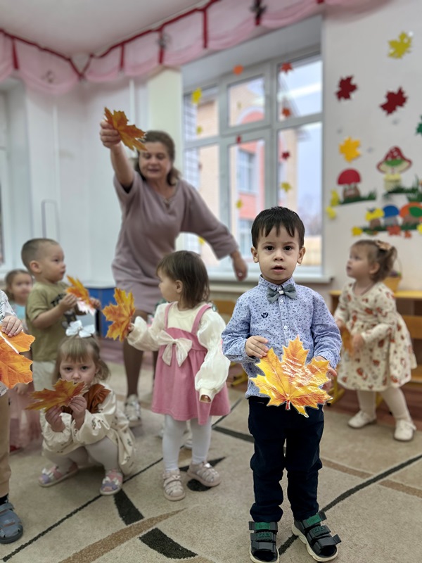 Вот и наступила золотая осень - самая красивая пора года! Осень любит жёлтые, красные, оранжевые краски. В такое прекрасное время года у самых маленьких воспитанников прошло осеннее развлечение "Осень милая, шурши!". Малыши радовались яркому украшению группы. К ним в гости пришла красавица Осень, весело кружась, рассыпала листья из корзины. Дети очень обрадовались её появлению. Вместе с ней они станцевали танец с разноцветными листочками, спели песню про дождик, поиграли в весёлые игры "Собери листья", "Солнышко и дождик" Праздник прошёл интересно и весело. В конце малышей ждал сладкий сюрприз. Какой же праздник без угощения? Наши воспитанники остались довольны первым праздником в детском саду!