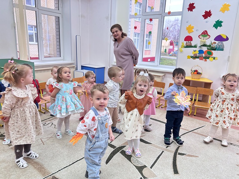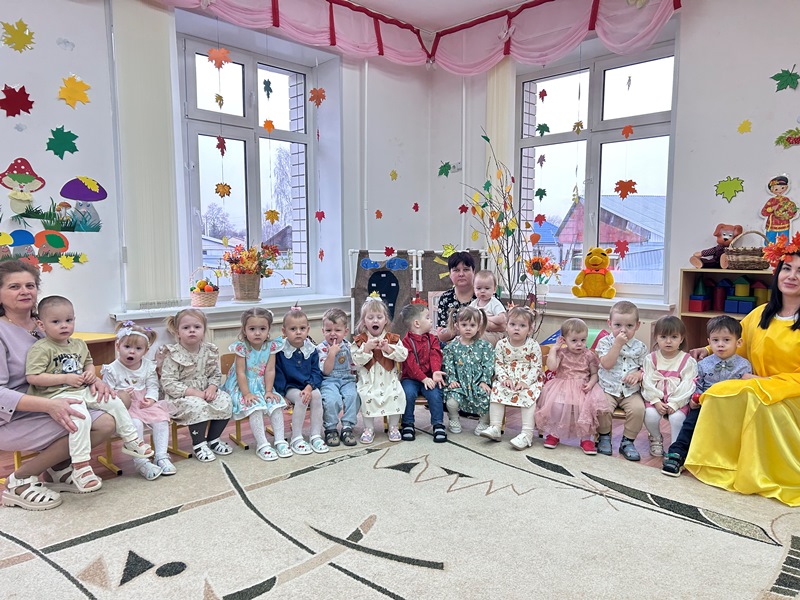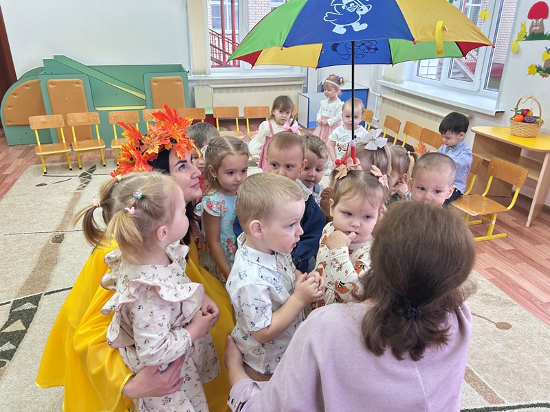 На веселом паровозике малыши отправились в гости к Осени. Все для них было волшебным, сказочным. Красивая и веселая Осень играла с ребятами, пела песни, танцевала. Малыши с радостью гуляли по группе под красивую осеннюю мелодию, с увлечением хлопали в ладошки. Но вдруг налетела хмурая тучка и пошёл мягкий дождь. Дети прятались от дождика под зонт. А под деревом от дождя, вырос необычный гриб. Открыли детки шапочку, а там корзина с угощениями.