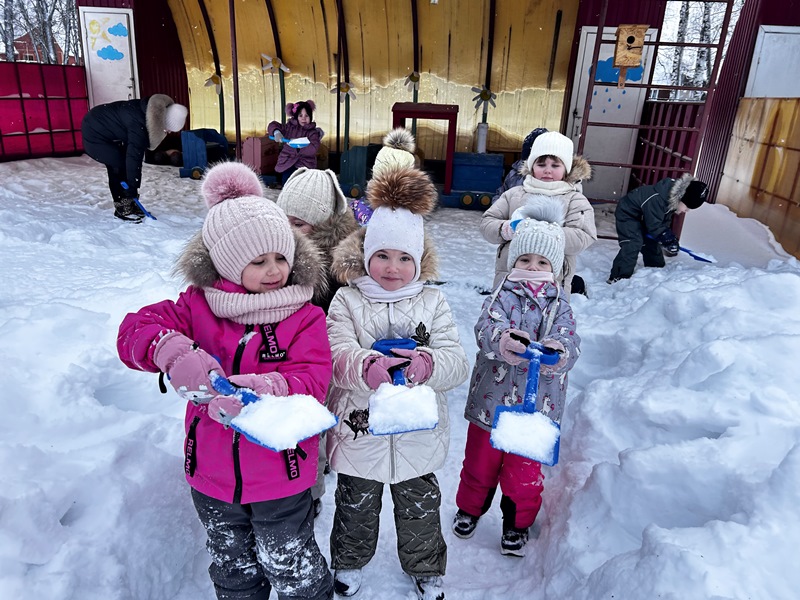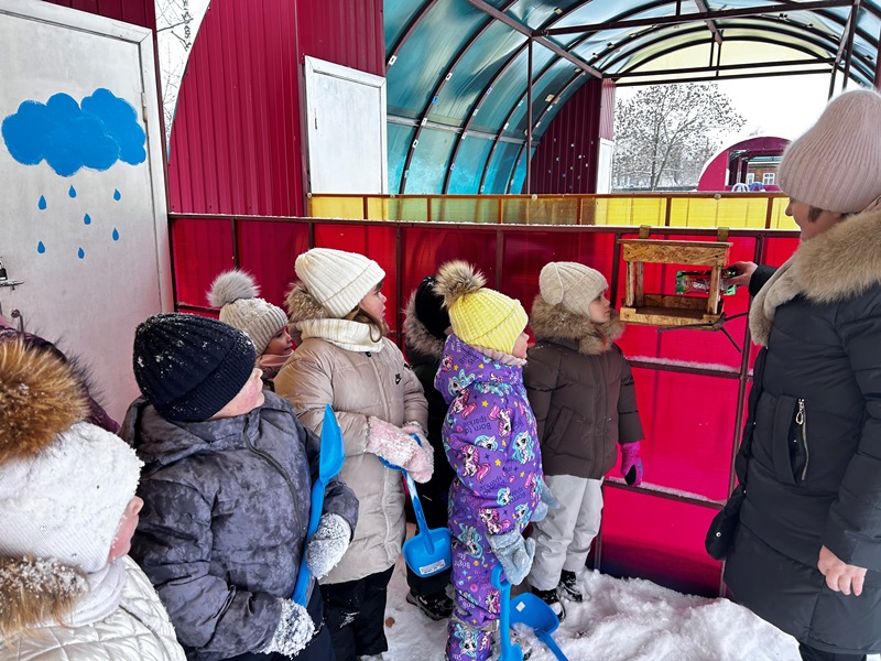 Мы играем в снежки, копаем снег лопатами, кормим птиц, рассматриваем снежное убранство деревьев и кустов...