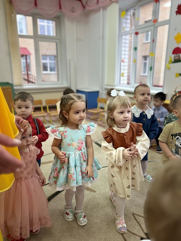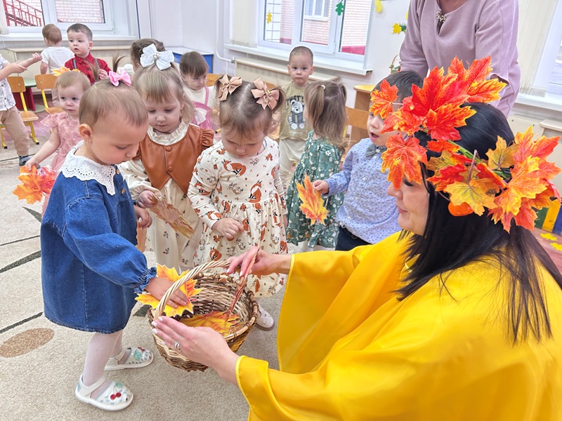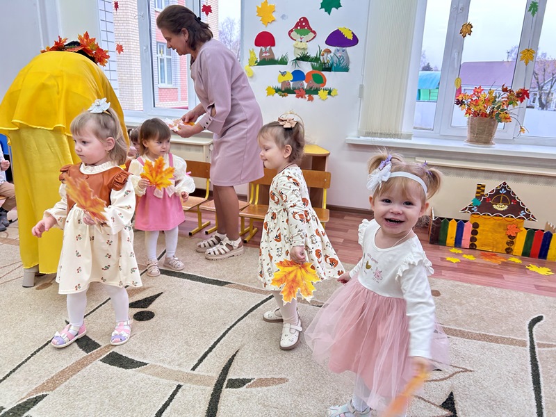 На веселом паровозике малыши отправились в гости к Осени. Все для них было волшебным, сказочным. Красивая и веселая Осень играла с ребятами, пела песни, танцевала. Малыши с радостью гуляли по группе под красивую осеннюю мелодию, с увлечением хлопали в ладошки. Но вдруг налетела хмурая тучка и пошёл мягкий дождь. Дети прятались от дождика под зонт. А под деревом от дождя, вырос необычный гриб. Открыли детки шапочку, а там корзина с угощениями.
