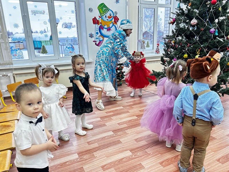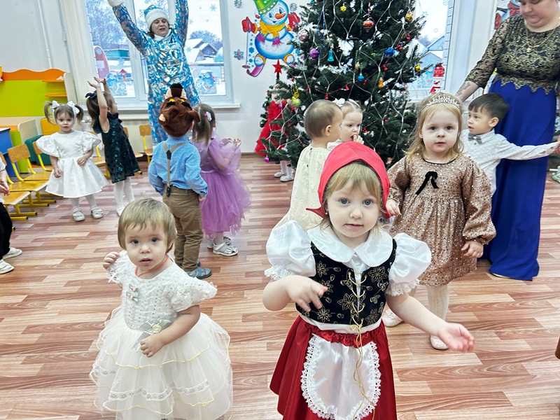 Малыши пришли нарядные и превратились в веселых зайчиков, мишек, красивых снежинок. Вместе со Снегурочкой закружились все в новогоднем хороводе. Все дружно водили хороводы, играли в снежки, танцевали с погремушками.