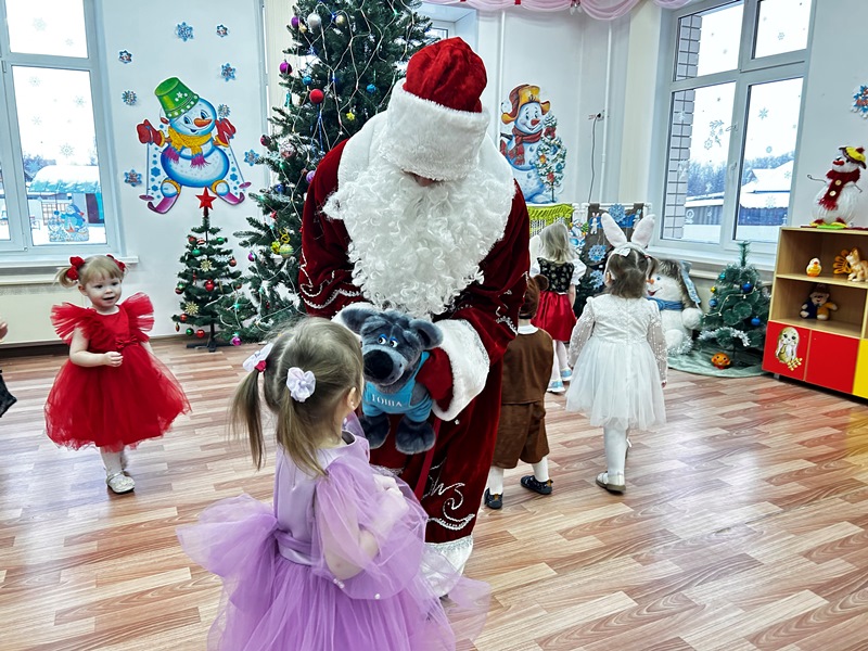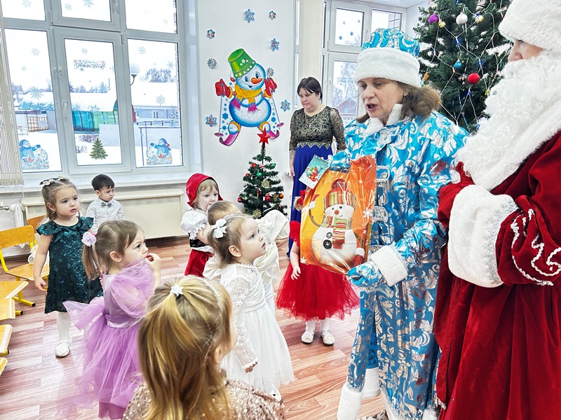 Помогли Снегурочке зажечь огоньки на новогодней елке. После такого волшебства приехал добрый Дедушка Мороз на своем паровозике и привез много сюрпризов.