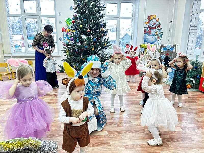 Малыши веселились у нарядной ёлки вместе с весёлым снеговиком и шустрым зайчиков, искали спрятанную морковку с подарками. А на прощание каждый малыш получил новогодний подарок и весёлое настроение!
