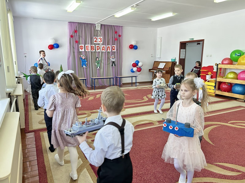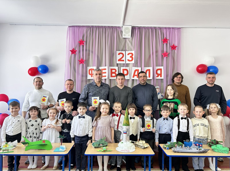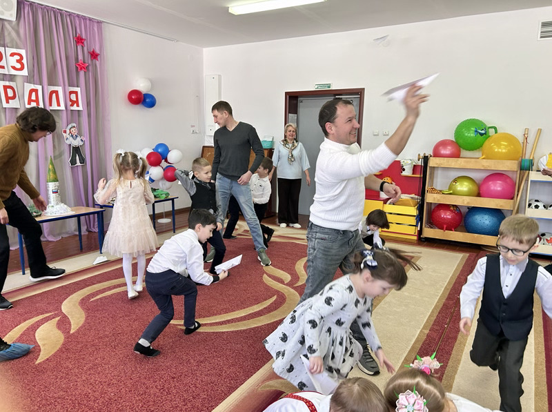 Торжественным маршем шли ребята, представляя военную технику разных родов войск, которую смастерили вместе с родителями. На празднике звучали стихи, песни. Девочки подарили гостям шутливый танец. Папы провели мастер-класс по изготовлению самолетиков и приняли участие в игре-соревновании по их запуску.