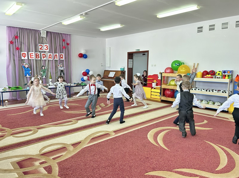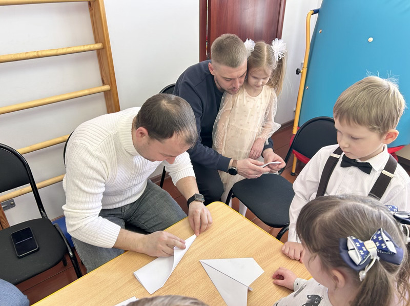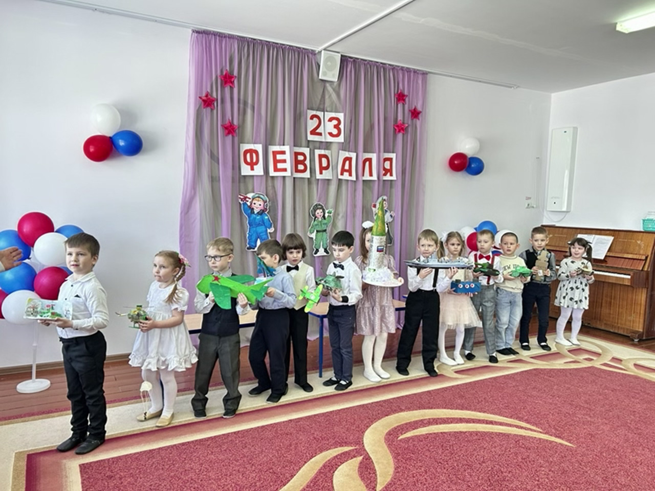 Торжественным маршем шли ребята, представляя военную технику разных родов войск, которую смастерили вместе с родителями. На празднике звучали стихи, песни. Девочки подарили гостям шутливый танец. Папы провели мастер-класс по изготовлению самолетиков и приняли участие в игре-соревновании по их запуску.
