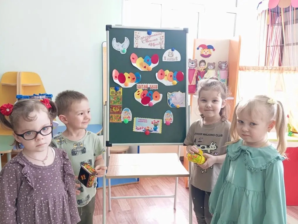 Сегодня в нашей группе прошёл тематический день, посвящённый светлому празднику Пасхи. В ходе беседы малыши узнали о добрых традициях: ароматных куличах и ярких пасхальных яйцах.