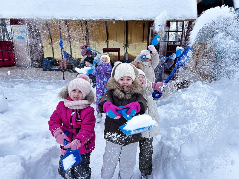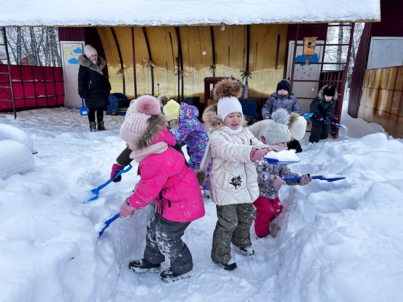 Мы играем в снежки, копаем снег лопатами, кормим птиц, рассматриваем снежное убранство деревьев и кустов...