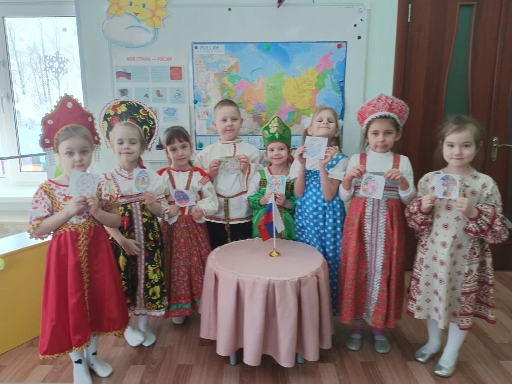 В предверии этого праздника дети узнали об истории праздника, рассматривали иллюстрации, познакомились с символикой России: гербом и флагом. В гости к дошколятам пришли куклы в национальных котюмах. Игра "Собери матрешку" наглядно показала малышам, что мы - дети одной матери, нашей общей Родины - России.